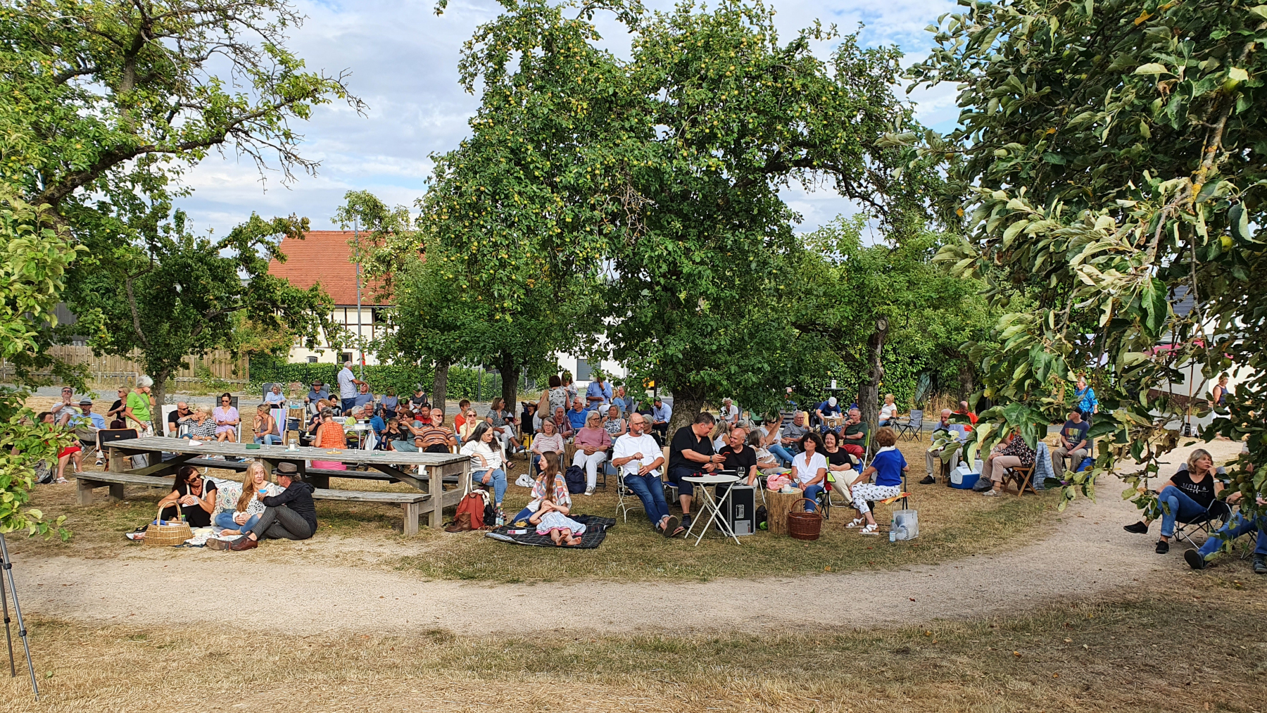 Das Konzert mit Masen Abou-Darkan auf der Picknickwiese ist buchstäblich ins Wasser gefallen! Die Musiker begannen bei schon drohendem Wolkenhimmel in der Hoffnung, das Gewitter möge vorbeiziehen. Leider tat es das nicht. Nach ca. einer halben Stunde poetischer Musik öffnete der Himmel seine Schleusen. Kurzer Hand wurde das gesamte Equipment wasserdicht verpackt oder ins trockene Feuerwehrgerätehaus gebracht. Viele fleißige Hände fassten mit an.